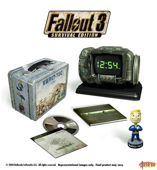 輻射飯盒?沒(méi)搞錯(cuò)吧,搖頭晃腦的避難所小子人偶?硬皮封面的美術(shù)設(shè)定集?制作花絮DVD?沒(méi)錯(cuò)。最有趣的是那個(gè)看上去像是嗶嗶小子3000的復(fù)制品,很可惜,只是一個(gè)電子時(shí)鐘,不然嘞,你真的以為是游戲里那個(gè)能看看自己有沒(méi)有缺胳膊少腿、有沒(méi)有被輻射嗆到的酷玩意兒?jiǎn)??別想了。